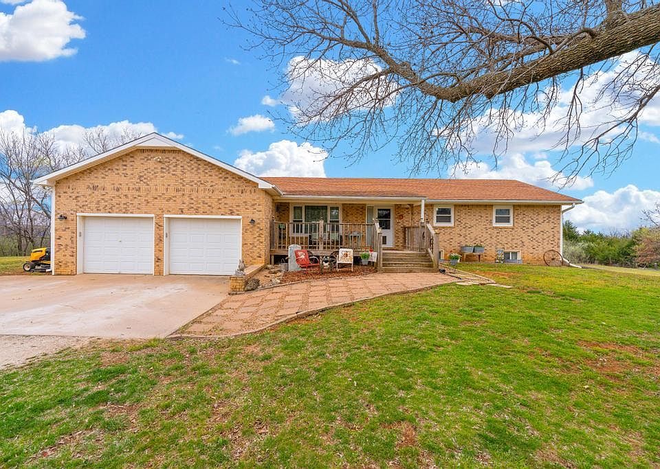 Escape to your private retreat on 10 acres nestled in the picturesque landscape right outside of Douglass. This sprawling ranch home offers the perfect blend of comfort, space, and natural beauty. The main floor of the home has 3 bedrooms, one full bathroom, along with an ensuite bathroom off the master bedroom. The open-concept layout seamlessly connects the kitchen, dining room, and living area, creating an inviting space for gatherings and entertaining. Check out the unique bamboo tiger stripe hardwood that carries throughout the main level! There is a mud room located off the attached garage entrance that is a nice storage and pantry area. The large basement is complete with a family room, game/billiard room, and a large laundry area. The bedroom downstairs connects to a spacious bathroom featuring double sinks and a shower. There is a bonus room that was used as a bedroom previously but does not have an egress window. With a walk-out design, the basement boasts convenience and accessibility, making it perfect for entertaining or accommodating guests. Built for family living, this home offers ample room to grow and thrive, both indoors and outdoors. The septic and lagoon were new and installed in 2015 and this home is all electric. The pond area in the back with an island will hold some water when there is enough rain and is filled by runoff when we have a wet season. The storage container and shed will stay with the property if the buyer would like them. This beautiful acreage is an easy commute to Wichita! The listing agent is related to the seller.
