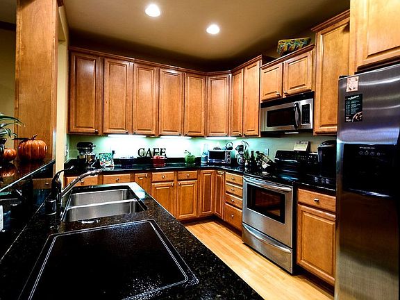 Luxury 2 BR + Den Townhouse far above the others with $38,000 in upgrades! HWF, custom maple cabinets, granite, SS appliances, finished rec room w/ bath, crown molding, fireplace, tiled baths, whirlpool, huge master suite, west facing balcony to enjoy sunsets, attached 2.5 garage. Walk to shopping, library and civic center concerts & farmer's market. Enjoy the onsite pool, fitness center & clubhouse!