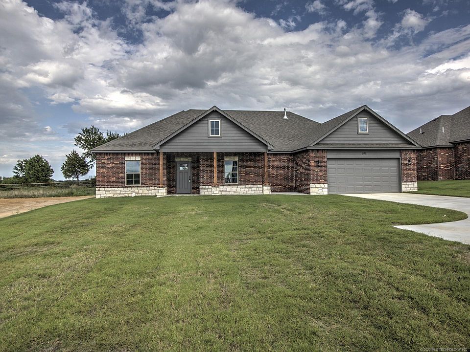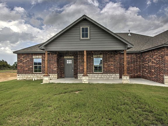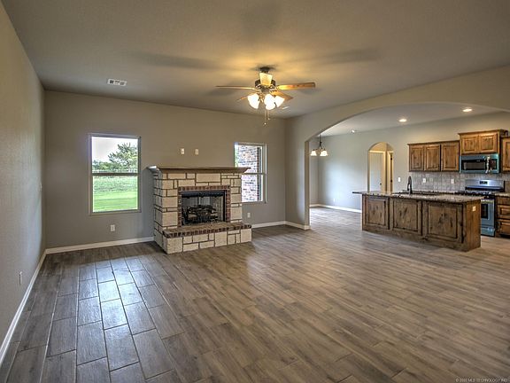 New Construction, open concept, living with fireplace open to kitchen with granite, split bedrooms, office, utility w/cabinets, master bath w/ 2 vanities, walk-in shower and whirlpool tub. Covered Porch and Patio. School and view of golf course are close by.