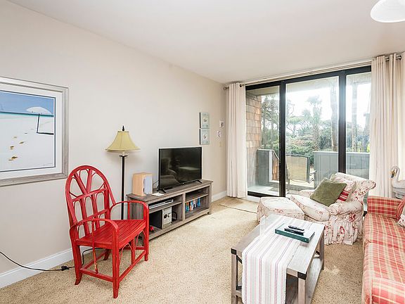 Step into the foyer of 2171 Shipwatch Road, and straight ahead you'll see the seaside palmetto trees swaying in the breeze. The view is showcased through floor-to-ceiling glass doors in the great room which open to a covered porch. Here, a short flight of stairs leads down to a stone-paved path and beach boardwalk no. 6.