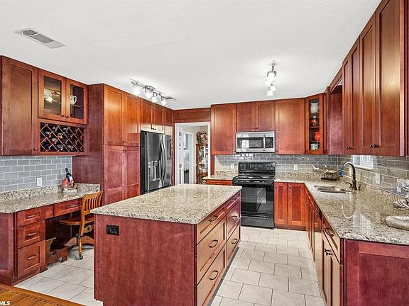 This Beautiful Brick Home is located in the popular Spanish Cove subdivision on the Bay side in Lillian, Alabama. Situated on a high elevated and level lot, this home has a large fenced back yard with a 14x28 Storage Building.. This home is immaculate and in pristine condition and recently upgraded with beautiful finishes. You will love the NEW kitchen with new Cherry Wood Cabinetry featuring two (2) pantries, LG French Door Refrigerator, Bosch Dishwasher, Electric Stove w/Convection Oven, Wine Rack, Large Island with tons of storage, and Gorgeous Glass Backsplash. Other new renovations include a new shower, new lighting, two new heat/air systems, Central Vacuum system, wall safe, new hot water heater elements and new interior paint!! Other features include an office, large formal dining room with 14' ceilings. Large Double Garage with attic space and Nice Screened back porch with another separate patio for grilling! Spanish Cove offers loads of amenities which include a beach area, club house, pool, tennis and tons of activities to keep you in shape! The home is very Energy Efficient with High Impact Windows, Extra insulation and a New Metal Roof! This quiet neighborhood is perfect and just a short walk to the Club House, Pool, Fishing piers or take a bike ride. If you are looking for beautiful home in a quiet and serene location, this is it!!