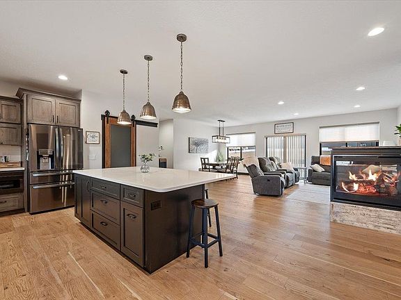 Built by Voss Custom Homes, this thoughtfully crafted zero entry home in the beautiful Top Shelf Development boasts curb appeal, unique design elements, functionality, and a few surprises! Offering an open concept entrance, 9 ft ceilings, a GORGEOUS kitchen with high end Starmark Cabinets, elegant quartz countertops, a grand island 8 feet long that seats 6 with storage on both sides, and beautiful pendent lights above. Note the easy-close barn door at the pantry, the custom-made range hood and floating shelves to match! The primary bedroom is on one side of the house with two guest bedrooms on the other, offering privacy for all. No worries if you need extra storage space for decorations and belongings as this home has storage closets, a large functional laundry room, a full crawl space as well as an upper storage/workshop area from the garage. If you have an RV/camper or a visitor with one, park on the already poured 15x36 concrete pad with 50 amp hookup and sewer cleanout. If you like efficiency, you will enjoy features such as the Irrigreen geofence high efficiency sprinkler system...no wasted water and the insulated crawl space with high efficiency mechanical systems. The garage boasts 896 finished sqft with hot/cold water/sink/shelving and 10ft wide by 9ft tall garage doors. Do you like to spend time outdoors? The back patio measures 25X13 and is plumbed for a gas firepit and/or bbq.