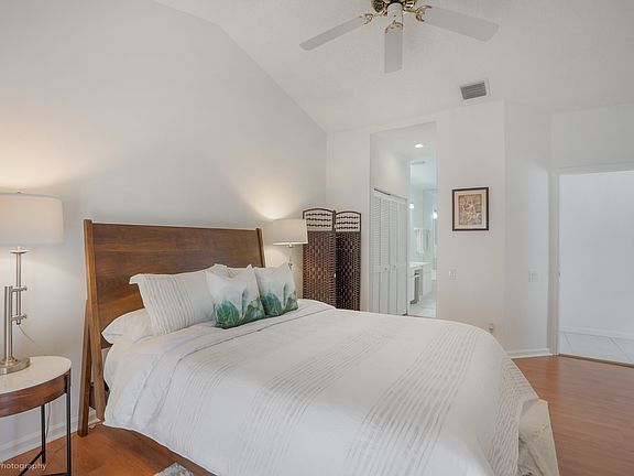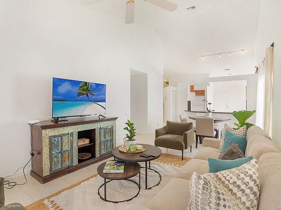 Beautiful one-story home situated in the greatest Town Center location. The open floorplan boasts soaring ceilings, plenty of natural light, ceramic floors, and wood plank flooring in the bedrooms. The backyard provides additional outdoor living area ideal for relaxation and entertaining. 24 hour gated security, heated communal pool and spa, and a beautifully planted lakeside walking trail. The rent includes cable and internet service supplied by the HOA, as well as front yard maintenance. 1 year