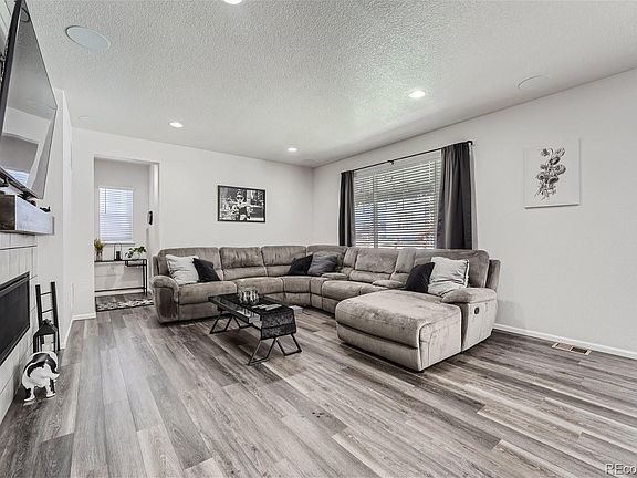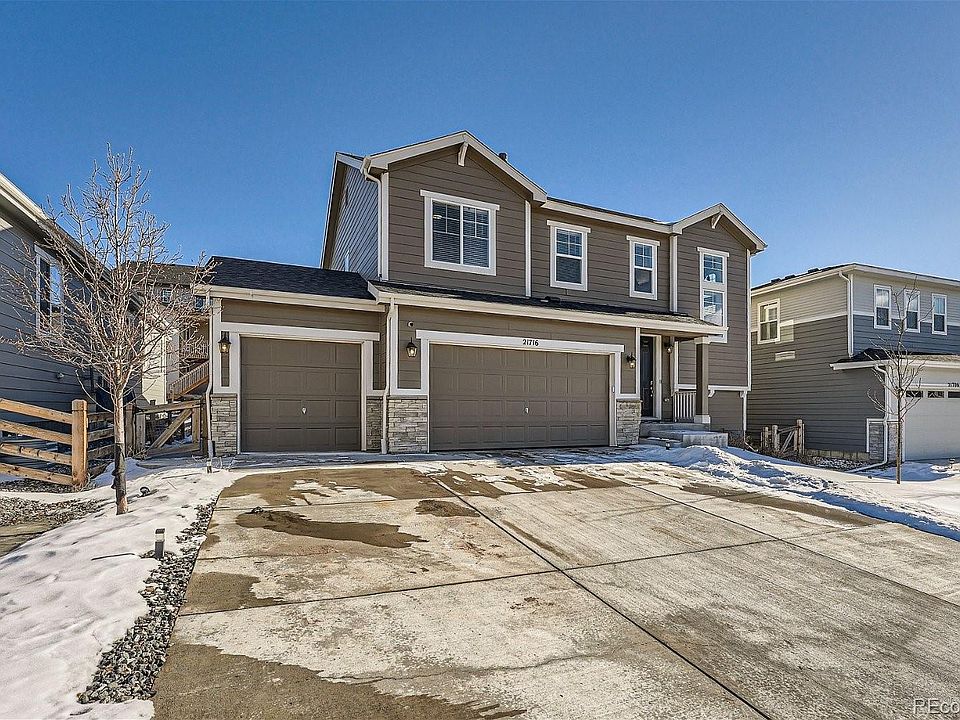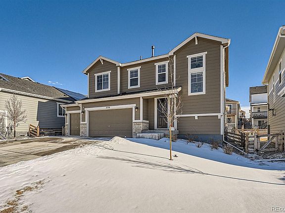 This stunning nearly new, move-in ready home will capture your attention from the moment you walk in the front door with all of the classy and upgraded design center finishes. The entry way into the main gathering part of the home is welcoming. The gourmet kitchen boasts a large granite island with seating for 6, perfect for family and guests and opens into a very welcoming family room with a main floor half bath, laundry room, extended room option, spacious pantry and desk nook. Off the kitchen is the design option bonus space, perfect for a dining room and/or sitting room. This room has vaulted ceilings, natural light and perfect for entertaining or a gathering space. The open concept flows perfectly and perfect for any entertaining or gathering. The gas fireplace in the family room creates a very warm and inviting space for cold days and evenings. The covered patio in the beautifully professionally landscaped backyard with extended concrete patio and sidewalk is sure to have you enjoying the outdoors all year long! Upstairs you will find an open loft, perfect for a home office, media room, and/or sitting room. The primary suite has an ensuite bathroom and huge walk-in closet. Two additional secondary bedrooms are on the second level as well as a spacious main full bath. This home also has a full unfinished basement for you to add additional space to your liking. A three-car garage will leave you with plenty of space for storage and more. Commuting is made easy as this home is conveniently located minutes from E-470. Close to shopping and recreation with nearby Aurora Reservoir, trails, and Southlands Mall. Just a few minutes near Buckley AF Base and DIA. Come and see this beauty today!