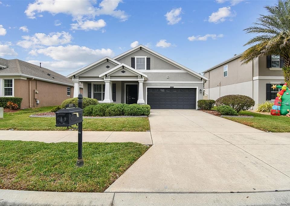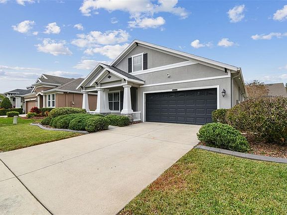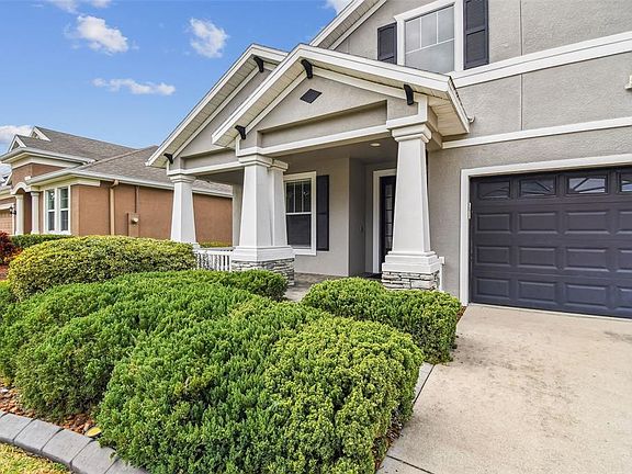 Welcome home! Don't miss this stunning Taylor Morrison floor plan in the heart of Connerton! From the moment you arrive, the beautifully manicured lawn and charming craftsman-style exterior set the stage for this remarkable home. Step inside through the 8-ft front door and you’re greeted by soaring ceilings, upgraded flooring, and a meticulously maintained interior. Just off the foyer is a dedicated home office and the formal dining room, which features impressive ceilings and convenient access to the kitchen. A circular foyer with tray ceilings leads to a full bathroom, two secondary bedrooms, and the laundry room with garage access. Continue through to the expansive living room, designed for effortless entertaining with its open-concept layout. The living room and primary suite also feature custom Somfy Smart Motorized Blinds, offering comfort, convenience, and modern style with the touch of a button. This home is also equipped with a Vivint Smart Home Security System with cameras and a central control panel plus full Alexa compatibility across all smart-home features providing seamless control, added peace of mind, and modern connectivity. The spacious kitchen offers an eat-in nook, quartz countertops, luxury stone backsplash, and abundant cabinetry, providing both beauty and functionality. Tucked off the living room, the primary suite includes a large walk-in closet and a spa-like bathroom complete with a soaking tub, seamless glass walk-in shower, and dual vanities. Sliding glass doors open to your private outdoor oasis. Enjoy a screened-in lanai, paver patio, lush landscaping, a smart sprinkler system, an outdoor gas fire pit, and a charming pergola with a swing—perfect for relaxing or soaking up Florida sunshine! Residents of Connerton enjoy exceptional community amenities including a resort-style pool, splash park, playgrounds, parks, and tennis and basketball courts. This home combines luxury, comfort, smart-home upgrades, and the best of Florida living. Schedule your tour today!