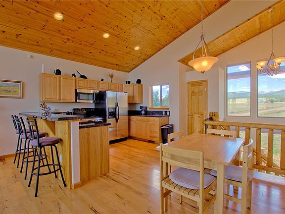 Magnificent 360 Views surround this beautiful cabin on 2.5 acres bordering over 1000 acres of State then BLM Land! Features include T&G ceiling, wood flooring, rock fireplace, granite counters, SS appliances, high ceilings, wrap-around deck with log accents, & 896 sq ft unfinished lower level to do as you wish. Within highly desired Foxtail Pines, area has private fishing pond & Gazebo, National Forest access, county maintained roads, & 35 minutes to Breckenridge, reservoirs, & Arkansas River!