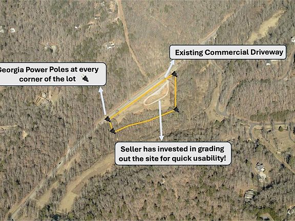 This is the flattest piece of land you will find in all of Lumpkin County! This property is absolutely perfect for someone that needs a quick, centralized location for their business. Commercially zoned. 2.3 miles north of the HWY 400/60 intersection where the brand new Publix and Tractor Supply just opened. 8,900 vehicles per day pass this location. The property already has a commercial driveway entrance (this is a $100,000 value ALONE!) and has been graded with a fence around the entire perimeter. GA Power poles are at every corner of the property. NO state waters on the property that interrupt the flow of building and present frustrating buffers/unusable space. Lumpkin County operates on "land use" zoning, rather than traditional zoning. This means you can do almost anything here by right - no dealing with the politics of how a vote will go, stressing about "extra conditions" randomly thrown at you, or public hearings. If you don't need a building, you can literally start your business day 1, or if you need a building, all you have to do is have your building plans drawn and start building. Water would be accessed by drilling a well, sewage would be a septic tank, which is no different than most developments in Lumpkin County. *This land is also for rent for $2,000 per month*