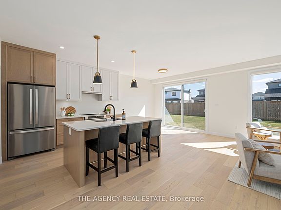 Situated across from a peaceful wooded forest park, 2172 Saddlerock Ave invites you to a lifestyle immersed in nature on a quiet street. Enjoy a leisurely stroll through the park, watch the kids at the playground or watch them having fun at the half basketball court, all from the comfort of your front porch. Showcasing beautiful natural-toned engineered hardwood flooring throughout the main level, staircase and upper hallway, complemented by 9 ft ceilings, a soothing colour palette and thoughtfully selected finishes enhance the feel of this home. The kitchen features quartz countertops, two-toned maple cabinetry in crisp white and natural tones, under-cabinet lighting, an extra-wide kitchen island, stainless steel appliances, and a walk-in pantry with a freezer that can convert to fridge mode. Bright and airy open-concept living and dining areas showcase impressive 8 ft 8 ft windows and 8 ft 8 ft patio doors, creating a seamless indoor outdoor connection to the premium pie-shaped yard. A powder room and inside entry from the garage add functional ease. Upstairs, discover 3 spacious bedrooms. The primary suite offers double doors, a large walk-in closet, and a 4-piece ensuite with double vanity, quartz countertops, and a luxurious tiled shower. A main 4-piece bathroom, convenient upper-level laundry, and linen closet complete the upper level. The unfinished basement offers plenty of storage and potential for additional living space. Inviting curb appeal, paver stone driveway, double car garage with insulated doors, garage door openers and a handy exterior side door for convenience. Families will love the proximity to new schools, including Northwest Public Elementary (with childcare), and St. Gabriel Catholic Elementary, just minutes away. This nearly new home has $30,000 + in upgrades and just under 6 years remaining on the transferable Tarion warranty. Enjoy the perfect blend of nature and a park just steps away, ideal for family fun and making lasting memories.