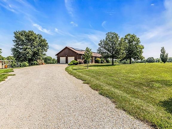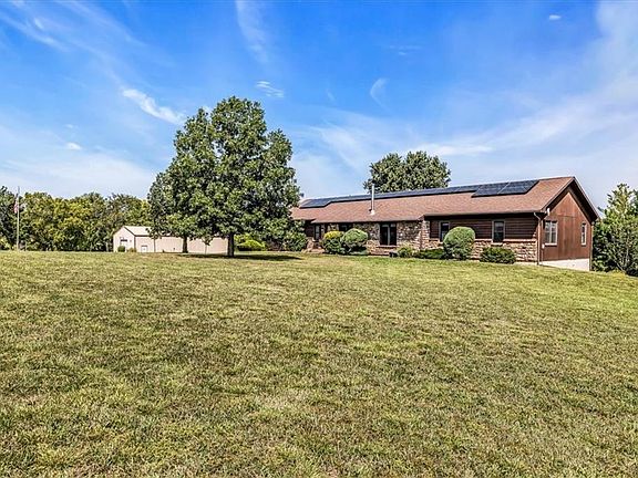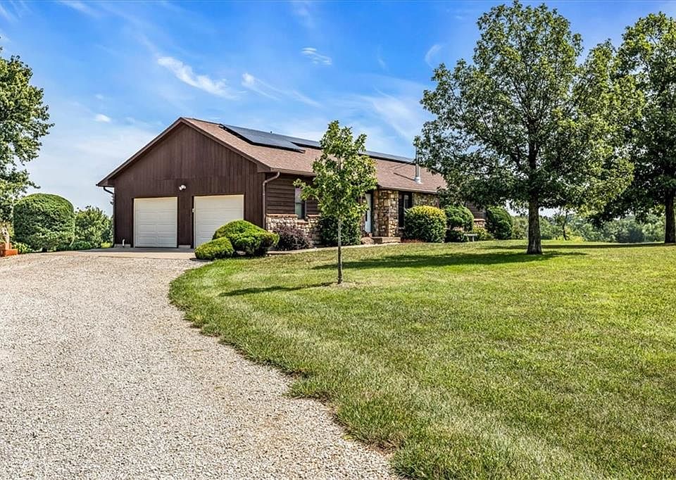 Discover this incredible 21-acre property in Linwood, KS, offering the perfect blend of country charm and modern convenience. This expansive ranch home, featuring a finished walkout basement, presents a unique opportunity for those seeking serene views/privacy or business opportunities with easy access to blacktop roads and major highways. This 3-bedroom, 3-bath home is the epitome of energy efficiency, equipped with paid-off solar panels, resulting in an average monthly electric bill of just $5-6. The seller has also added 11 inches of insulation to the attic for extra energy savings and a whole house backup generator. Inside, you'll find spacious rooms with stunning hardwood floors, a gourmet kitchen with stainless steel appliances, granite countertops, and an oversized island perfect for entertainment. The property also features a 30x60 outbuilding complete with concrete flooring, electricity, and dual overhead doors. The exterior is a gardener's dream, featuring beautifully landscaped gardens with vibrant flowers, trees, and an asparagus garden. The picturesque setting is enhanced by purple martin birdhouses and a decorative windmill, creating a peaceful environment for relaxation. The enclosed porch is thoughtfully designed with east/west solar shades, screens, and 4-track stacking vinyl windows, allowing you to enjoy the outdoors in comfort. Situated close to I-70, K-10, and just off K-32 Highway, this location offers convenient access to Lawrence, Topeka, Kansas City, and the nearby Panasonic plant in De Soto. Don't miss your chance to embrace country living at its finest!