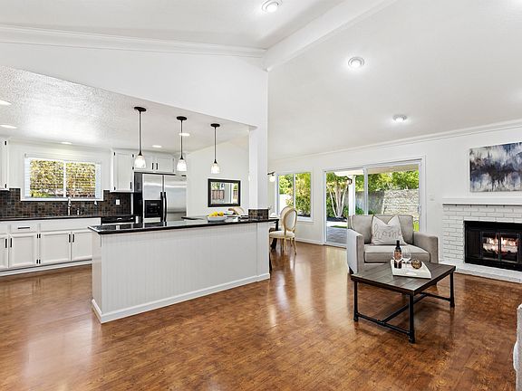 WELCOME HOME to this turn key one story situated on a large corner lot with HUGE SIDE YARD ACCESS. Step inside the WEST facing front door into a spacious and bright interior with new paint, plank floors and recessed lighting. The great room style floor-plan is open to kitchen and dining areas. Upgraded kitchen features abundant white cabinetry, new black hardware, slab counters and L shaped island with seating and pendant lights. Primary suite features recessed lights, ceiling fan, slider to backyard and fully remodeled en-suite bath with walk-in shower. Upgraded energy efficient dual pane windows throughout and FULLY OWNED ELECTRICAL SOLAR! Backyard is a true extension of the home with a large covered overhang, and drought friendly turf. New custom wood and iron double gates give you access to the side yard with endless possibilities for a potential ADU , pool, play structure, basketball court, RV parking and more. Indoor laundry room with abundant storage and slab counter. WASHER, DRYER AND REFRIGERATOR INCLUDED! Walking distance to nearby schools and shopping. MUST SEE!
