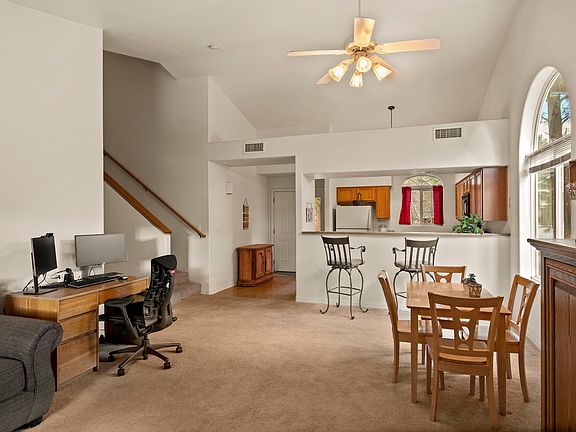 End unit with vaulted ceilings. Feels bright, open, clean, and spacious inside! Quiet and private feel outside. Main floor Bedroom with ensuite bath. Upstairs bed and bath are both spacious with ample closets. Lots of storage space. This well-cared for townhouse has everything you need and is walking distance to the grocery store. Easy access to NAU campus, interstate, and National Forest.