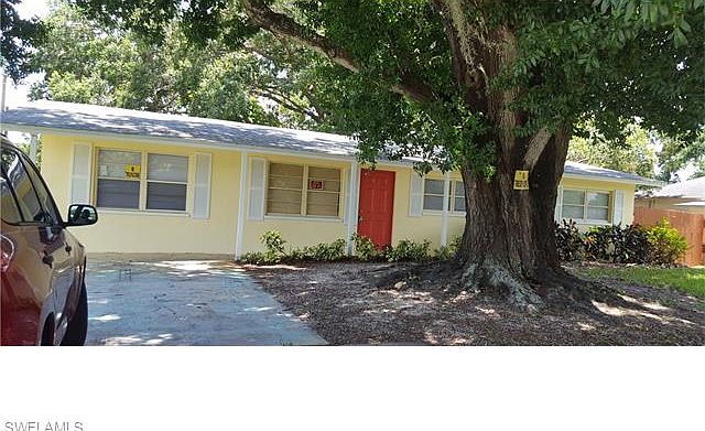 Oversized corner lot in the Shores.One block from canals. New wood kitchen cabinets, granite, SS dishwasher, stove and microwave. New bathroom with granite. New Laminate flooring. There is an enclosed lanai as well as a pavered patio, fire pit/brick cooking pit and shed with electric to it. Fully fenced yard is great for kids or dogs and offers privacy and security. Home has been freshly painted inside and out and is move in ready. A/C replaced in 2015. Roof repair in 2015 resulted in 90 of roof replacement. Side fence on Fifth opens with double doors to accommodate a vehicle. Great Shores location on all schools' bus lines and just a few blocks from Palm Beach Blvd for Lee Transit bus lines. Excellent access to great schools through School Choice. Room for another bathroom if motivated.