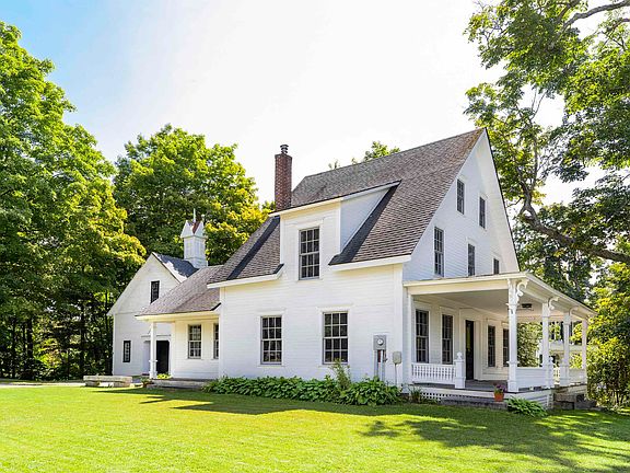 Perched on a shady hill overlooking the village of Bradford, this charming Cape, built in 1850, has been completely renovated with antique features such as the antique stairway, the front door with stained glass, the broad front porch with original decorative railing, hardwood floors and a big BARN (not renovated). Everything else was done in 2015, including new paned windows, 3 baths, kitchen, doors and insulation. Rooms include kitchen with propane stove, dishwasher, and refrigerator. Spacious livingroom, 1st floor office, 2nd floor has 2 nice bedrooms with baths, nice attic room, perfect for a closet, and on the 3rd floor, a new playroom/bedroom. The basement has a granite foundation with 10 year old heating system/oil heat, hot water off boiler with storage tank, water pump, and washer & dryer connections. Nice flat open lot, nice sunsets! School is nearby, and skiing at Mt. Sunapee, bank, shops, restaurants, and town beach on Massasecum.