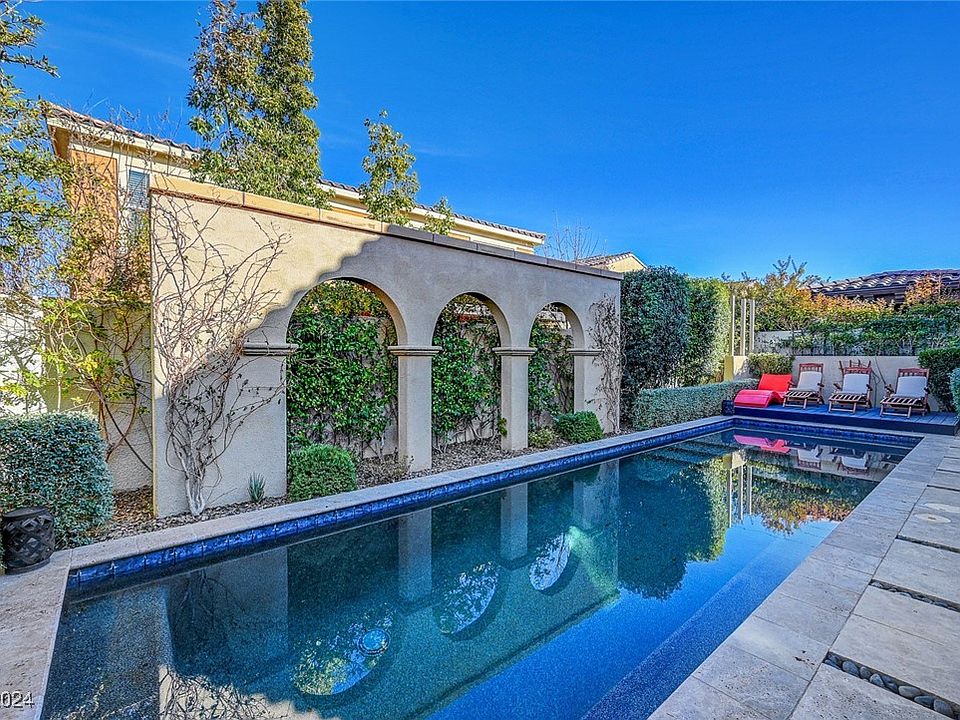 Former model home that's fully furnished located in Inspirada. No neighbors across the street. You have a view of the community park from your front door. 1-bedroom suite with its own living space and bathroom downstairs. Gorgeous kitchen and great room ensure everyone can watch the Big Game together. Granite countertops, extra large kitchen island, stainless steel appliances, pendant lights. Four-panel sliding glass door leads to a lush backyard. BBQ under the covered patio, while your guests take a dip in the pool. It's a garden paradise complete with loungers to sit in the pool on a summer's day. Upstairs, has a 2nd living area, 3 bedrooms, & views of the mountains. Upgraded carpet through the 2nd floor. Big primary bedroom with a generous walk-in closet. Bathroom features dual sinks, separate tub and shower. Surround sound & custom window coverings throughout the house. Tankless water heater, whole house water filtration & epoxied garage floor.