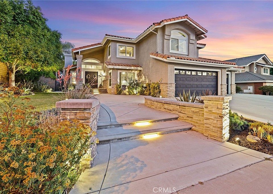 Beautiful Yorba Linda home features modern bright white and gray tones, recessed lighting, upgraded casings and baseboards, gorgeous rich brown Wood flooring makes for an elegant space. The step-down living room boasts high ceilings, a stunning stone fireplace, plantation shutters and flows seamlessly into the dining area with high ledge decorative shelving and sliders that lead to the backyard. The large walls of windows allow an abundance of natural light to illuminate the open floor plan throughout. The kitchen impresses with clean white cabinetry, Granite countertops, full stone back splash, a quaint eating area, built-in buffet with long countertops, drawers, storage and cabinets. A walk-in pantry, center island with electric cooktop, breakfast countertop for high bar stool seating and pendant lighting. Appliances include single oven, microwave and dishwasher. The oversized windows overlook the spectacular backyard. The family room has recessed lighting, a stone fireplace, surround sound wiring installed and TV ready, designated closet for home automation/smart home items. The downstairs bedroom is perfect for an office or a guest bedroom with custom built-ins, adjacent is a full bathroom, single vanity and tub in shower. The inside laundry room has storage, utility sink and a door for direct access to the backyard. Up the stairs to the spacious primary ensuite that features a step up to the extensive built in closet with organizers and out on to the balcony to marvel in the amazing sunset views. The private spa-like bathroom features dual sink vanity, glass enclosed step in shower, separate soak tub with a view. The secondary bedrooms are a generous size with a ceiling fan, mirrored wardrobe closet doors, wainscoting and blinds. The full bathroom features single sink vanity and tub in shower. Relax in the beautiful pebble tech saltwater pool with led optional colored lights, solar panels for pool heating, waterfall features and spa, safety fence, covered patio, overhead heater, TV, speakers, upgraded hardscape, firepit, shed, upgraded rod iron fencing and gates with deadbolts. Three-car garage with direct access, storage, tankless water heater, RV/boat parking, A/C, whole house fans and dual pane windows. No HOA. Nearby park, shopping, restaurants, schools, easy access to the 91, 5, 55 freeways and toll road. Welcome Home. See the MLS supplement.