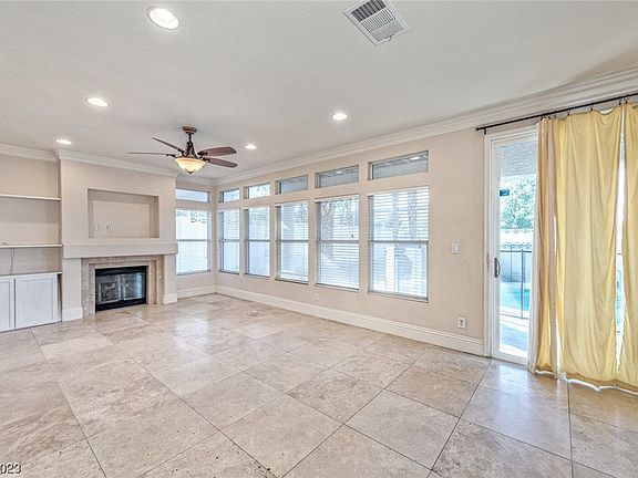 This immaculate home offers many upgrades and designer custom touches. Travertine tile throughout, custom floor, crown moulding, custom KraftMaid brand cabinetry, granite and brushed nickel finishes throughout, high end kitchen appliances, salt water converted pool and more!. Large master retreat including master bath with jetted spa tub and walk in shower with multiple shower heads. Located in the heart of Green Valley within walking distance to shopping, dining, parks and zoned for some of the areas best schools. This spacious home is one of a kind and has a large open floor plan that is light and bright with neutral paint and high ceilings. The kitchen has been upgraded for an entertainer's delight and offers beautiful custom cabinet, granite countertops with stone tile backsplash, island, recessed lighting, stainless steel refrigerator and appliance. Formal dining area, eating area and family room that flows into the kitchen with an inviting fireplace. The curved staircase will take you to the large master bedroom and two other junior bedrooms. It comes completed with a large covered patio, fenced off pool and spa, large grass yard and a sitting area to enjoy the desert sun and create memories. This home is turn-key ready, highly appealing and shows wonderfully.