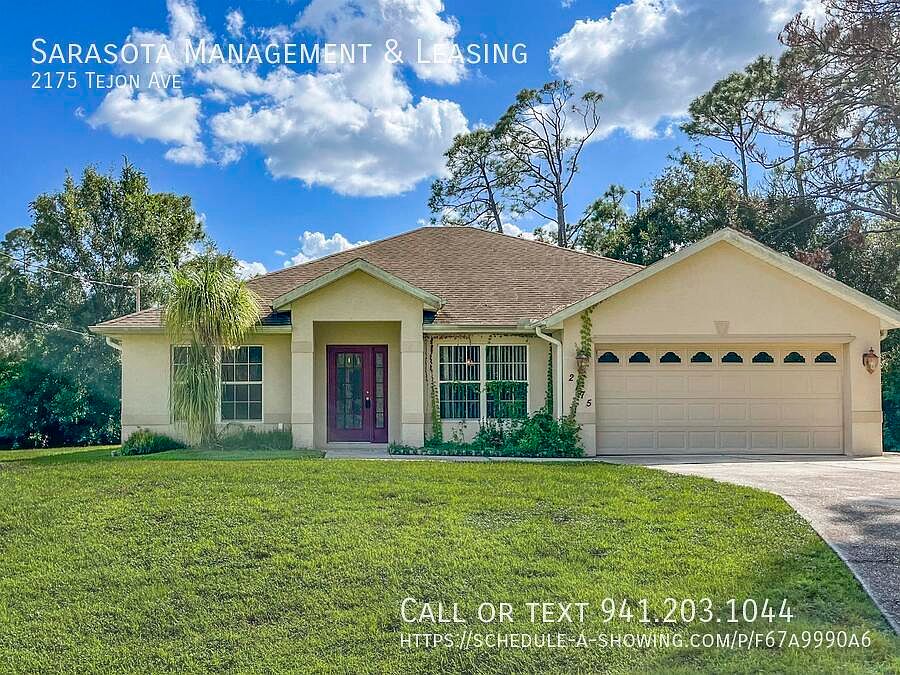 This is a 3 bedroom 2 bath home built in 2006 with lots of upgrades. This open, split floorplan home features a great room with tile floors set on a diagonal and the living room has sliding glass doors to a large screened in patio. The gourmet eat-in kitchen has granite countertops, stainless steel appliances, a breakfast bar at the kitchen peninsula and a pantry. The master bedroom also has sliding glass doors to the patio, his and hers walk-in closets, and the master bathroom has his and hers sinks and a walk-in shower. There are two spare bedrooms and a spare bathroom with a tub / shower combination. There is a laundry room with washer / dryer included and a 2 Car Garage. The agent is available to show this home on Wednesdays and Saturdays from 3pm - 6pm. Property is on Well / Septic. This home is located near Myakka State Park and I-75. Take Toledo Blade Boulevard North of I-75 street name changes to Choctaw Boulevard, turn left on Tropicare Boulevard then left on North Chamberlin Boulevard, turn right on Tejon Avene. We score every application. If an application doesn't score high enough, the resident may be required to place the equivalent of two months' rent in a security deposit. Please be aware that leasing this property includes a non-optional Home Assistant Services Package that will cost an additional $30 per month. These services and their cost are separate from Tenant's monthly rent payment and all other payments described in the Lease or any separate Lease addendums.