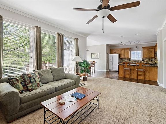Tranquil view backing to treed greenspace. Two outdoor living spaces with deck off main level and patio access from walkout basement. Touch of nature to enjoy even when inside through the large windows across back of home. Custom tiled floor in two story entry. Living room features a fireplace plus built-ins. Open kitchen boasts of counter space and cabinets, granite counter tops, plus opens to dining and living room. Primary suite offers backyard private view plus shower, soaker tub and large walk in closet. Bonus laundry on bedroom level. Secondary bedrooms each have a window seat. Walkout finished basement includes family room, 1/2 bath and wet bar plus a tiled area for games, hobbies or entertaining. Utility room has hobby work area and storage. Three car garage features utility sink, spigot and heater. Seller offering $5000 in closing cost with an accepted offer for carpet or upgrades of buyer's choice. Summer fun ahead with neighborhood pools and club house. Location close to highway access, amenities and schools.