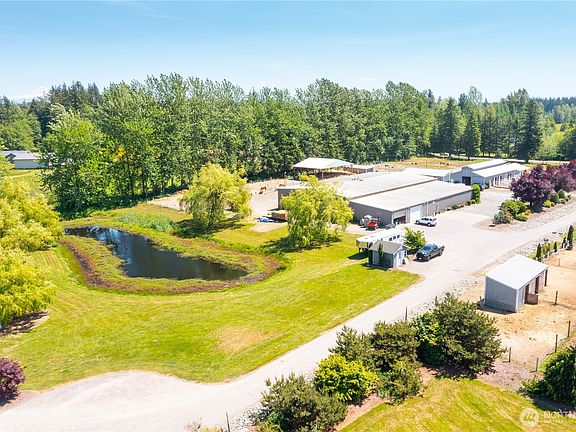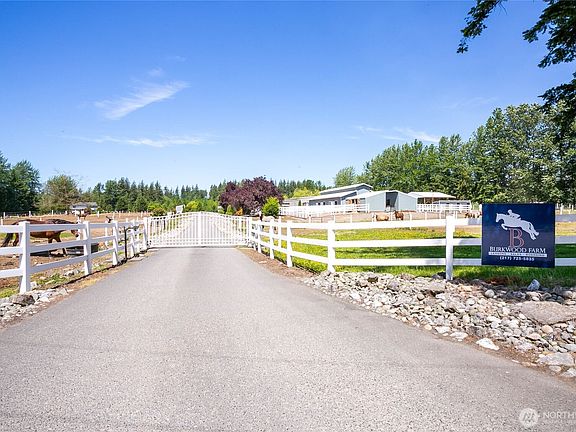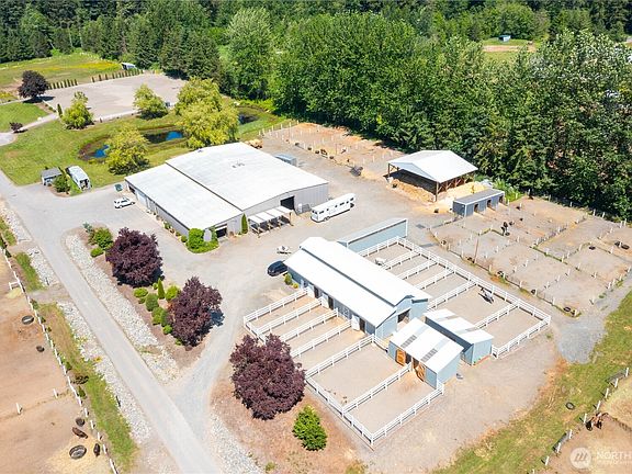 Welcome to Burkwood Farm, a Whatcom County equestrian property on shy 18 acres ideally located between Blaine and Lynden, and just 20 minutes from Thunderbird Show Park. This fully equipped horse property features 30+ stalls (including stalls with runs), two barns, a 120’ x 60’ covered indoor arena, and a 250’ x 175’ outdoor arena, fully fenced and cross-fenced with pastures and gravel paddocks. Additional amenities include loafing sheds, hay storage, covered shaving bin, heated indoor and outdoor wash racks, two tack rooms, and a grain room—making this a turnkey training or boarding facility. The 4+ bedroom home offers an updated kitchen and flexible living spaces ideal for multi-generational living or rental potential. An attached 3-car garage, RV parking, paved driveway, two ponds, and gated entry add convenience and privacy. With home and barn on separate parcels and easy I-5 access to Vancouver, BC or Seattle, this versatile property is perfectly suited for equestrian, agricultural, or hobby farm use while offering a peaceful Pacific Northwest lifestyle.