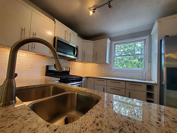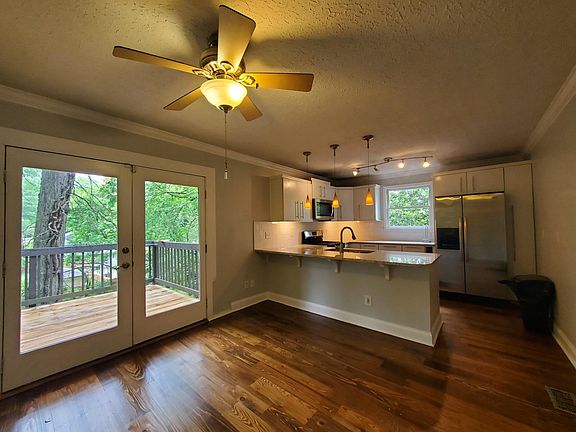 This completely remodeled three bedroom, two bathroom bungalow in the Riverside neighborhood is a secluded refuge just minutes from Midtown. It features warm hardwood floors throughout and a spacious living room and dining room with built-in cabinets. The large eat-in kitchen with granite counter tops and stainless steel appliances is perfect for entertaining and connects to a beautiful teak deck with panoramic treetop views. A luxurious primary bath with rain shower, vessel sink and and jacuzzi tub sits just off the spacious primary bedroom, which features ample closet space and built in shelving. The second bathroom has a stylish claw-foot bath tub and faucets. Stacked, full-size washer and dryer are conveniently located in the main hall just off the bedrooms. Also has an unfinished basement perfect for storage or a work space. The house is on a large wooded lot perfect for outdoor entertaining with a picnic area, fire pit and space for a garden. Off street parking. This home is a dog owners dream! Access to the Westside Greenbelt, where there are miles of off-leash riverside trails to play on, is at the end of the street. Also, it is an easy walk to Whittier Mill and Spink-Collins Parks which are great for kids and dogs alike. Only 5 min from I-285 and S. Cobb Drive. Close to Vinings/Cumberland, Smyrna, and Midtown Atlanta. Easy access to 75/85 and Hwy 20. Owner/Agent Trend Realty Atlanta Renter is responsible for gas, water, electric, and yard maintenance. Pet deposit is $450 for dogs (refundable if no damage, less $75 flea treatment fee).