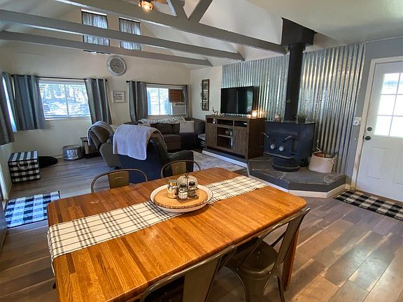 ADORABLE BUNGALOW SECLUDED AND PRIVATE WITH BEAUTIFUL SCENERY THIS HOME HAS BEEN RECENTLY UPDATED NEW BATHROOM OPEN BEAM CEILING AND MUCH MORE DESIREABLE AREA WITH ACREAGE POSSIBILITY FOR ANOTHER DWELLING ON PROPERTY EXTRA ROOM FOR ENTERTAINING SPACIOUS DECK RELAX AND BREATH IN THE FRESH MOUNTAIN AIR RECHARGE FROM THE HUSTLE AND BUSTLE OF LIFE ENJOY THE PEACEFULNESS OF THE TREES PLENTY OF PARKING FOR ALL YOUR VEHILCLES, TOYS & RV PERFECT TO SPEND YEAR ROUND OR JUST VACATIONING ENJOY A BIT OF SNOW IN THE WINTER BEING COZY THE WOOD BURNING STOVE FEELS RIGHT AT HOME FOR EVERYONE
