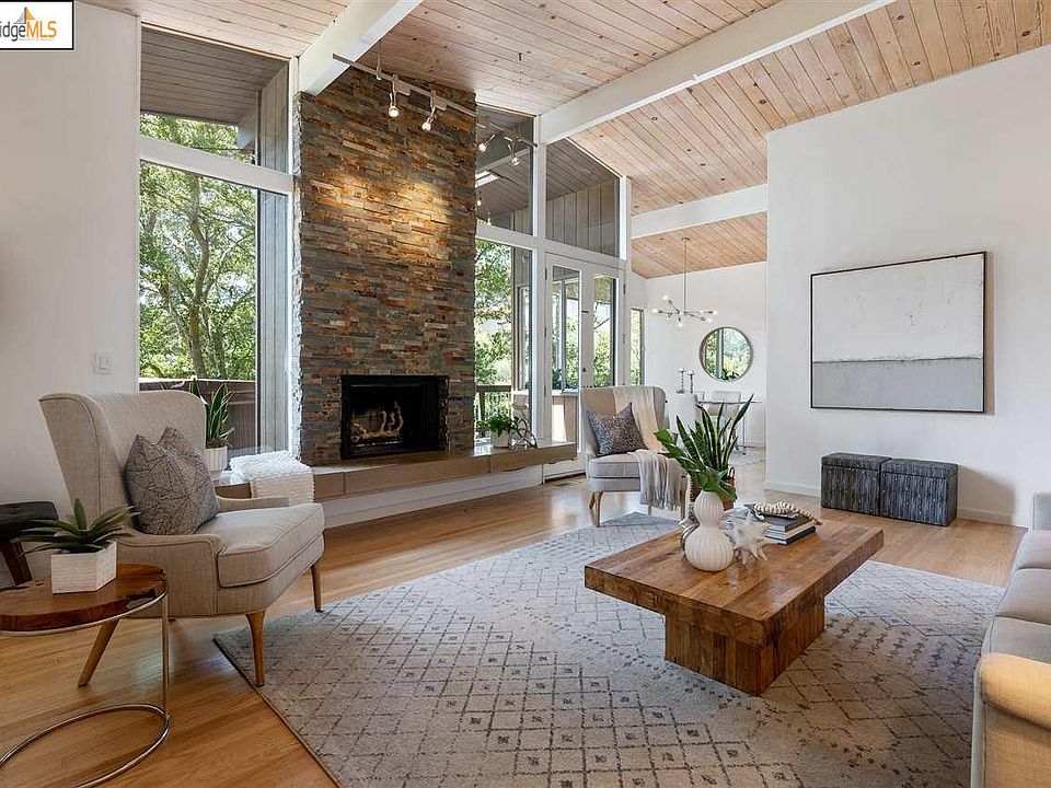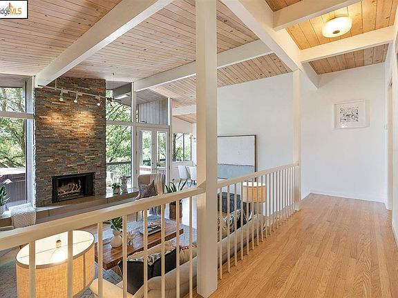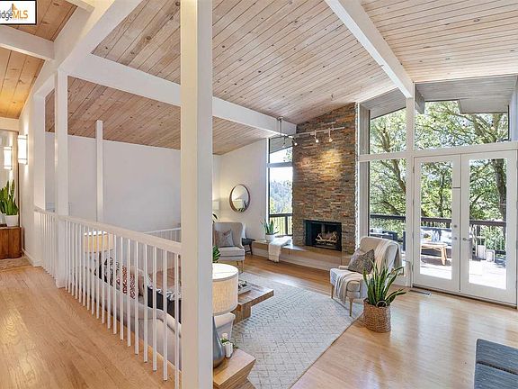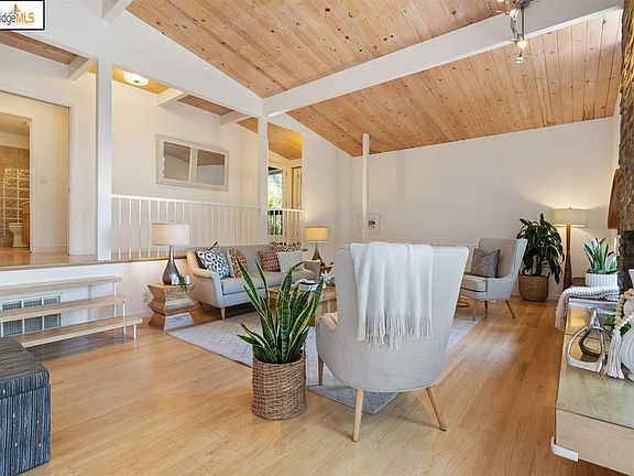 Dramatic Tom Lowe designed home with modern flare & set among the trees providing privacy & serenity! Public rooms with soaring, vaulted wood ceilings & walls of glass give a light & airy feeling . Living room has stacked stone fireplace with a floating, concrete sitting hearth & double doors that open to an expansive deck with hot tub. Newly updated kitchen with gorgeous new counters, brand new stainless steel appliances, and sit-up bar top for guests to visit while the chef performs magic! The upper floor is a split level with 2 bedrooms & full bath with glass block shower wall! Downstairs has been newly updated with hardwood flooring throughout for the owner's en-suite bedroom & generous sized family room with deck to take in the outdoor vibe & oak tree view. Many large closets for plenty of storage! Large 2 car garage w/two level 2 EV charger plugs on both sides & a flat driveway with ample off-street parking. Buffed wood floors and freshly painted!