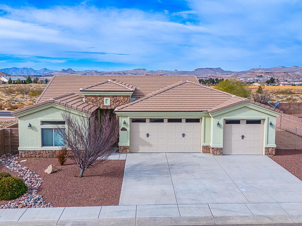 Welcome to your dream home built by Long Construction in Hualapai Shadows! This exquisite residence offers a perfect blend of elegance and comfort, surrounded by the tranquility of open space area next door and breathtaking panoramic mountain vistas, setting the stage for stunning evening sunsets. Step into luxury with custom features throughout, including natural faux stone decorative touches, a spacious kitchen island with sink, granite countertops, an ample pantry, beautiful wood cabinets, and top-of-the-line stainless steel appliances. The tiled backsplash and custom decor ceiling add a touch of sophistication to the heart of the home. Boasting 3 bedrooms and 2 full baths, the home is adorned with wood plank tile throughout the main areas, providing a warm and inviting ambiance, while plush carpeting in the bedrooms enhances comfort. The master suite is a sanctuary with dual sinks, a jetted tub, a shower with rain glass doors, a walk-in closet, and a bonus linen closet. The exterior is equally impressive, featuring faux stone accents on the front facade, block wall backyard fencing, an RV gate, and convenient side parking for all your desert toys.