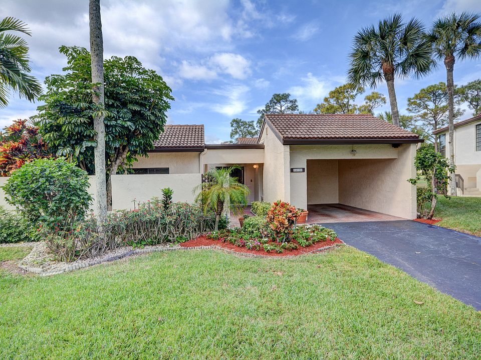 Gorgeous golf and lake views await the new owner of this up-dated villa in Boca Lago Country Club. This home is warm and inviting, all up-grades are done tastefully and home is in excellent condition. The kitchen has new higher end cabinets, granite counter tops and high-quality tile throughout. Wonderful opportunity to own in a country club without mandatory equity membership. Pet friendly.