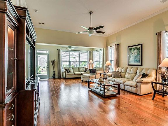 Immaculate 3BR/3BA home with a sunroom in one of the hottest neighborhoods in all of Myrtle Beach! Just a short golf cart ride to Market Common. Interior features hardwood floors throughout the entire first level, tile in all the bathrooms, and a tankless hot water heater. Kitchen is complete with upgraded Samsung stainless steel appliances, granite countertops, tile backsplash, a work island, pantry, and large breakfast nook. First floor master suite has tray ceilings, double sinks, and a huge tiled shower. Both guest baths also have tiled showers. Exterior features upgraded professional landscape package, irrigation system, and huge paver patio with pergola. HOA fees include exterior maintenance and landscaping, cable, a social director, monitored security system, and more. Cresswind offers resort style amenities including a magnificent clubhouse which features a huge fitness center, yoga/aerobics studio, arts and crafts room, computer center, social ballroom, party room complete with pool tables, and full kitchen. Outside the clubhouse offers two tennis courts, pickle ball courts, bocce ball, horseshoe pit, an amphitheater, event lawn, grilling area, fire pits, a huge resort style pool with hot tub, and miles of walking trails. All information is deemed reliable but not guaranteed. Buyer is responsible for verification.