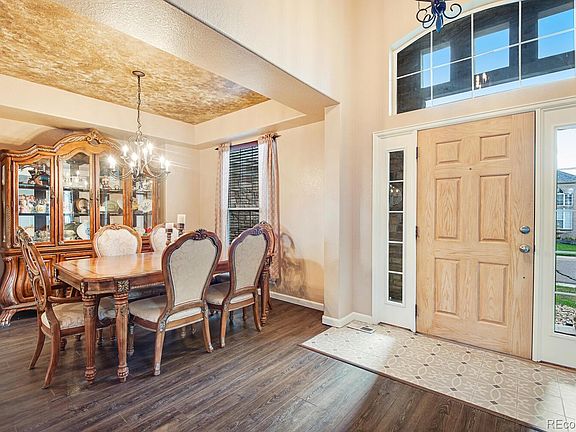 Welcome to the Harvest Ridge neighborhood. This gorgeous home has space for all and is perfect for entertaining. Welcome guests in the expansive foyer loaded with natural light, accented by a valuted ceiling and flanked by a formal living room and formal dining room. Enjoy the new luxury vinyl flowing throughout most of the main level and newer custom paint. Main floor office has double glass french doors and could be used as a fifth bedroom if desired. The rear of the home enjoys a wall of bright open windows in the family room with vaulted ceiling and cozy fireplace. The kitchen area boasts a butlers pass through to the dining room, granite counters, ample cabinets for storage and a large informal eating area. Upstairs you'll find four bedrooms and two full baths including the primary bedroom with five piece bath and huge walk in closet. The full finished basement features an open concept great room - perfect for a home theater with surround sound pre-wiring, pool table included, bar with sink and space for a mini fridge making this the ultimate hang out space. The basement is pre-plumbed to add a bathroom if desired and has a large storage area with shelving. Step outside and enjoy the spacious backyard. With a 8500 sqft lot, the backyard is a perfect size to play, entertain or enjoy with your pets. Backing to a walking path/green space allows for some privacy from neigboing homes. Much of the home has been recently updated including main level interior paint, TWO new water heaters, new luxury vinyl on main level. Convenient location along East 104th Avenue with quick access to the RTD Light Rail System to Downtown Denver or I-25 for commuting along the North/South corridors that offer an abundance of retail, dining and entertainment options. NEW PK-8 Explore school within walking distance.