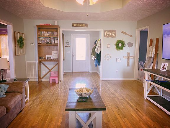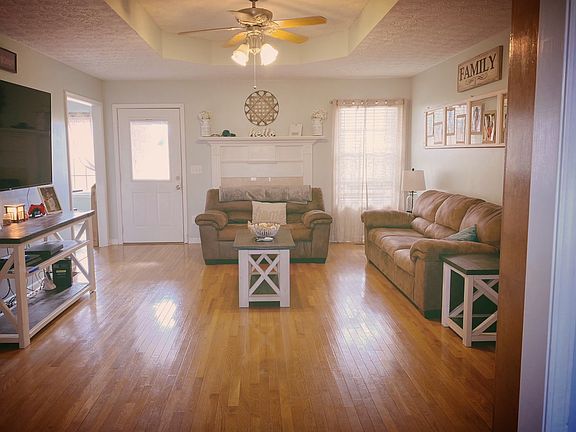 Adorable 3 bedroom, 2 bath home sitting on almost 2 acres. Trey ceilings and hardwood floors in living room, spacious primary bedroom. Gorgeous views from back yard. Shed with home stays. Just minutes from town.