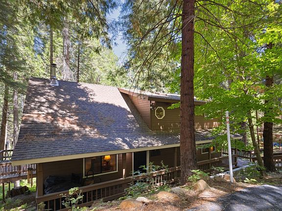 Surrounded by towering pines, this warm and inviting Arnold cabin features soaring wood-beam ceilings, a spacious great room with a cozy wood stove, and a bright open loft overlooking the main living area. The home blends modern touches with classic cabin charm, including updated kitchen cabinetry, granite counters, refreshed finishes, and beautiful wood accents throughout. Custom-built furniture designed specifically for the space is negotiable, along with a private sauna, making this home truly ready to enjoy from day one. Large windows bring in forest views, and the expansive wraparound deck provides the perfect outdoor space for relaxing, dining, or enjoying the peaceful mountain setting. This cabin is a turnkey opportunity located in a prime Arnold location close to White Pines Lake, the Arnold Rim Trail, Big Trees State Park, Sequoia Woods Golf Course, and nearby restaurants and shops. Enjoy year-round recreation including hiking, fishing, swimming, mountain biking, and winter skiing at Bear Valley. Optional HOA provides access to additional amenities if desired. A well-cared-for retreat offering comfort, character, and convenience.