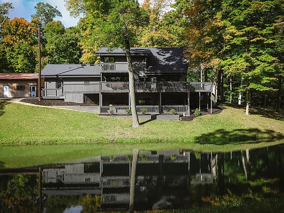 Welcome home to this amazing retreat! Situated on over 8 acres of woods, this amazing property has a beautiful pond and is nicely secluded! The stunning home is so inviting w/a modern rustic feel! The entry way is in view of the amazing windows w/ an awesome view! The high end kitchen boasts stunning granite, upgraded cabinetry, top of the line ss appliances w/ comm stove & grill, & built in garage doors! The great room offers beautiful flooring, a lg stone fp, amazing windows & industrial fixtures. Spiral stairs lead to the updated owners suite. The lower level offers addit'l finished space w/ bar/rec area & another bath, bedroom, & walkout to the ll patio. Spend your time on the two tiered porch while enjoying the property. 2 car garage and lg detached barn. Absolutely Amazing!