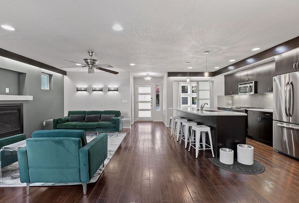 Inside, the home features modern finishes, an open kitchen with quartz countertops, a large island and a comfortable living area with a gas fireplace. Both bedrooms are upstairs and the spacious primary suite includes a huge walk-in closet and a step-in shower.