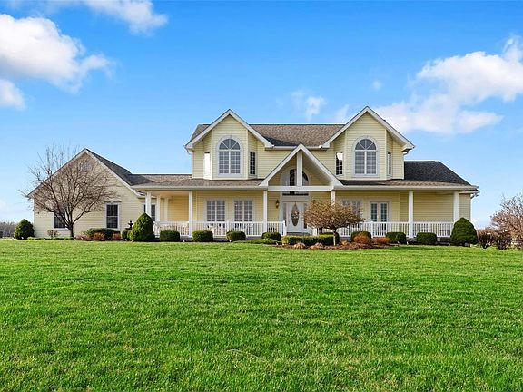Custom built 2 Story home on 20 acres. Grand entry foyer opens to the Great Room with wall of windows & wood burning, brick masonry fireplace with mantle & built in shelving on each side. Formal dining room with wainscoting. Custom wood cabinets in the kitchen with center island + bay window in lg.Breakfast Rm-additional wet bar area off to the side w/ ample amount of cabinets + office area. Luxury Master Bdrm w/French Drs leading to front porch-master bath w/jet tub, dual sinks, makeup vanity, sep. shower, wet bar area, & door leading to the covered back porch. Upper Level includes: Bdrm 2 with full private bath-Bdrm 3 & 4 share a Jack/Jill bath. W/O bsmt w/ workshop area + walk up bsmt steps to 3 car O/S Gar. Garage attic is lined w/ plywood & lighted for additional storage(has pull down steps)-MFL-Andersen windows/Peachtree doors-Enjoy beautiful sunsets on the lg. wrap around covered porch. 30x40 pole barn w/ 1+ horse stall, electric & water. Fenced pasture area for animals w/ pond.