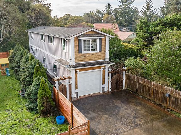 Delightful 2-story home situated down a private road in the charming city of Bandon. This home features a unique floorplan with kitchen, dining, laundry and a half bath on the main level. Living room, 2 bedrooms and a full bath are located on the second level. Kitchen Boasts tile countertops, a breakfast bar and a lovely garden window. All appliances included! Spacious primary room with built-in bookshelves. Great natural lighting throughout! Don't let the exterior photo fool you, garage has room to park 2 vehicles. Low maintenance, fully fenced perimeter with room for conversational set and planters. Conveniently located within walking distance to the local Post Office, restaurants, & shopping! Bandon is home to gorgeous beaches, the Coquille River, and the world-famous Bandon Dunes Golf Resort.
