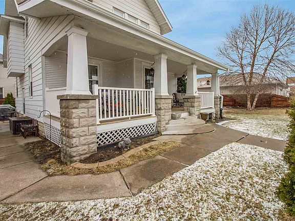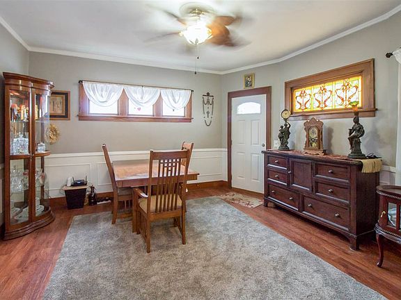 An inviting covered front porch welcomes you to this impressive three bed, two bath home. Outside you're sure to appreciate the oversized, detached two car garage with new vinyl siding, five car parking slab, and fully fenced yard, which comes complete with patio and play-set. Inside you'll find breathtaking original woodwork through the home. Spacious living room includes crown molding and French doors. Formal dining room shines with beautiful crown molding, wainscoting, chair rails, and the crown-jewel, a stunning stained glass window. Kitchen has loads of cupboard and counter-top space, a pantry, and a hanging pot rack. An updated three-quarter bath completes the main level. Upstairs you'll find three bedrooms and an updated full bathroom. Roomy master bedroom includes dual walk-in closets one with built-in shelving. Bathroom updates have just been completed and there's a new designer vanity, tub with stylish tile surround, and toilet. In the hallway outside the...See Documents.....