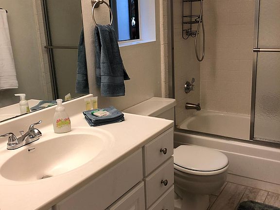 Lovely 2-bedroom, 2-bath detached second-story unit over the garage in the back of the property, 1.5 blocks from the beach. You can hear the waves at night! Large bedrooms with ample closet space (one is a walk-in), washer/dryer, trees add to privacy. Month-to-month. Tenant pays utilities. Available fully furnished for $3200/mo. (see photos)