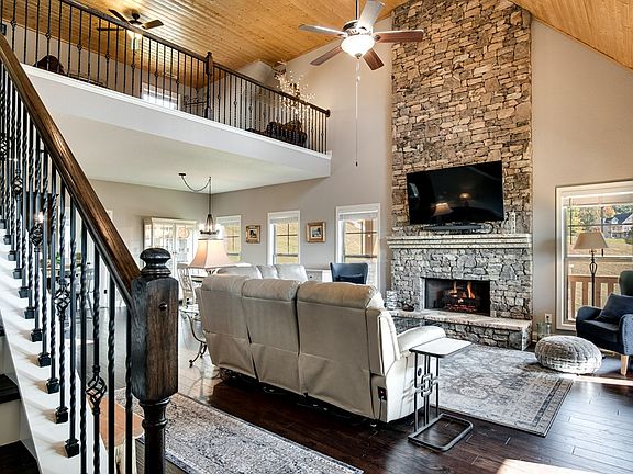 Gorgeous home with even prettier long range mountain views!! This home is immaculate and loaded with custom touches throughout starting with the stacked rock pillars that line the front deck. It's the perfect place for relaxing, overlooking the views, front yard and outdoor seating area around the fire pit. From the deck, enter into the living room with vaulted tongue & groove ceilings, floor to ceiling stacked rock gas fireplace, beautiful hardwood flooring and open feel. Kitchen is complete with granite countertops, island with breakfast bar, large pantry, wine closet, stainless steel appliances and opens to the dining and living room. Great windows with bright natural lighting. Large Master is tucked away with french doors to the deck, en-suite bath with dual vanities, walk-in tile shower and large master closet. Main level living with laundry/mud room off the 2 car garage. Half guest bath and bonus room on the main level, currently set up as additional living space. Upstairs loft is located right outside the upstairs bedrooms & full bath overlooking the living room, this space has so many options: office, sitting room or library take your pick! Vacation Rentals are allowed.