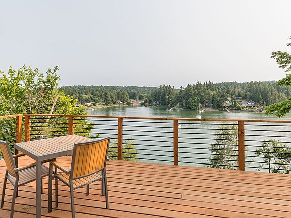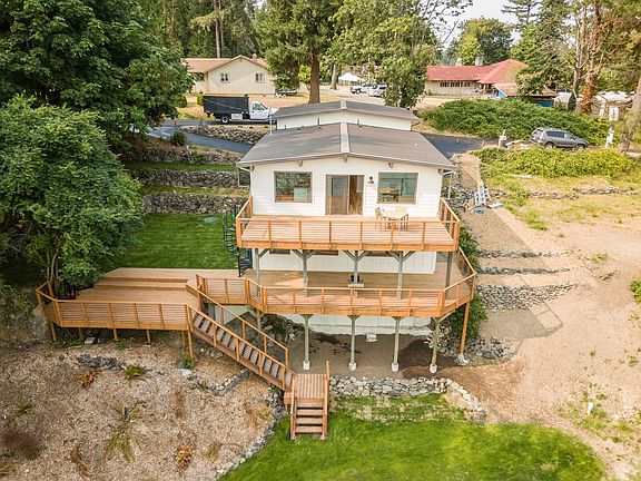 Waterfront beach home, completely remodeled w/133' of south facing deep water moorage. 2320 sf home features high end details and extraordinary finishes; quartz, bowling alley island, reclaimed wood, handmade tile and Viking kitchen. Open concept floor plan with gorgeous water views. Master bed with ensuite and laundry on main. Two bedrooms downstairs, large entertaining room with wet bar, and bathroom with exterior entrance for easy beach access. Watch the sun rise and set in this dream home.