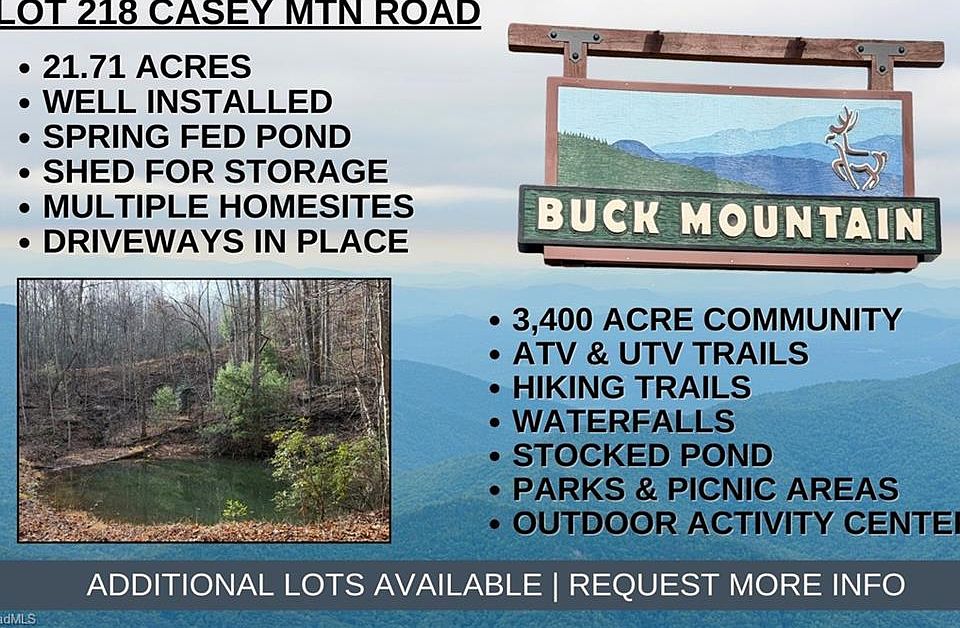 RARE FIND IN BUCK MTN - 21.71 acres w/PRIVATE WELL, SPRING-FED POND, ELECTRIC, SHED, SPRING, MTN VIEWS, ROADS & TRAILS for easy exploration. Lot 218 offers multiple building sites. Choose your spot & build the mtn home you’ve been dreaming about! Private Setting–Borders POA property to the east. Enjoy tranquil sounds of Little Creek running near the east property line. Located in 3,400 acre Buck Mountain...ONLY GATED ATV COMMUNITY in Wilkes Co. FIBER OPTIC available. Long & short-term rentals allowed. Travel Time to Buck Mtn: Winston 1hr, Charlotte 1hr40min. Centrally located 35 min to Boone, West Jefferson & Wilkesboro. Close to High Country Activities, BLUE RIDGE PKWY, ASU, shopping, dining, golf, wineries, breweries, mtn biking & skiing. BUCK MTN AMENITIES: ATV & Hiking Trails, Parks, Fishing Pond, Water Falls, Pavilions, Community Ctr, Helipad, Outdoor Activity Ctr w/amphitheater for concerts & community gatherings. 1,400 SF min. NO TINY HOMES. NO MOBILE HOMES. NO SELLER FINANCING.