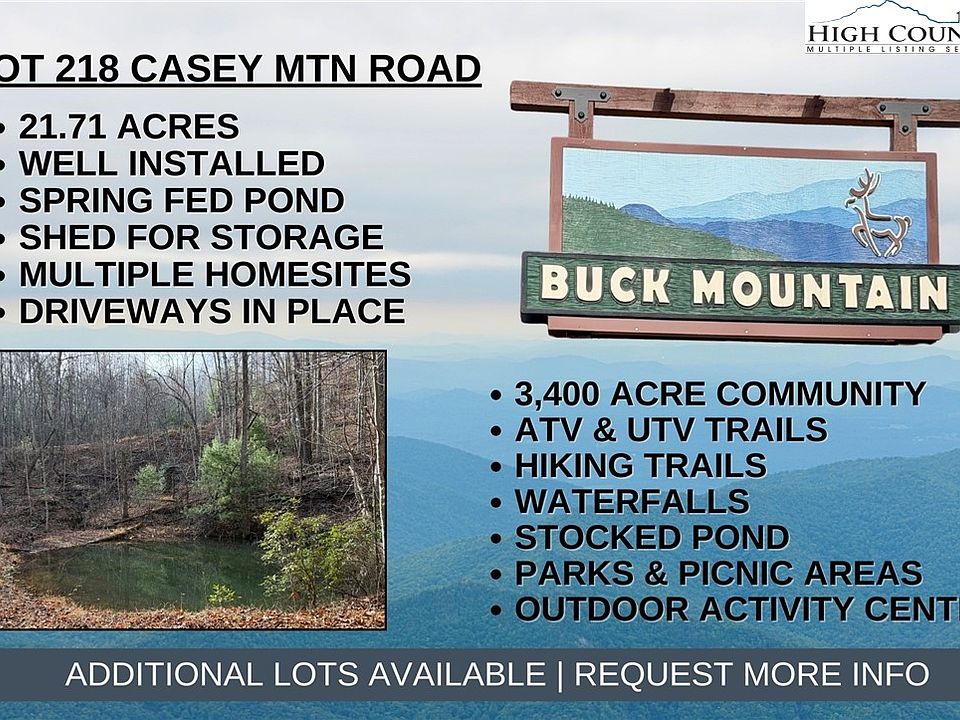 RARE FIND IN BUCK MOUNTAIN…21.71 acres with PRIVATE WELL, SPRING-FED POND, ELECTRIC ON LOT, SHED, SPRING, MOUNTAIN VIEWS, ROADS, and TRAILS for easy exploration. Looking for a quiet location in the mountains to build a weekend getaway and a place to relax? SAVE THOUSANDS - This property offers multiple building sites with easy access, roads and trails already in place, and a spring fed pond. Choose your spot and build the mountain home you’ve been dreaming about! This private setting is bordered by POA property to the east. Enjoy the tranquil sounds of Little Creek running near the east property line. Conveniently located in the 3,400 acre Buck Mountain community...ONLY GATED ATV COMMUNITY in Wilkes County. Bring your ATV or UTV and enjoy exploring your own property or the miles of trails within the community. FIBER OPTIC is available. Long-term and short-term rentals are allowed. Buck Mountain is a PRIME LOCATION! Arrive at the gate from Winston in only 1 hour and from Charlotte in 1 hour 40 min. Just minutes from High Country activities. Centrally located 35 minutes from Boone, West Jefferson, and Wilkesboro. Close to BLUE RIDGE PKWY, ASU, shopping, dining, golf, wineries, breweries, mountain biking and skiing. BUCK MOUNTAIN HAS HARD TO FIND AMENITIES like ATV Trails, Hiking Trails, Parks, Fishing Pond, Water Falls, Pavilions, Community Center, Helipad, Outdoor Activity Center with amphitheater for live music, community gatherings and so much more! Make lasting memories while spending the day hiking or riding ATVs on the miles of trails. 1,400 SF minimum building requirement. NO TINY HOMES. NO MOBILE HOMES. NO SELLER FINANCING. Schedule an appointment for your private tour today!