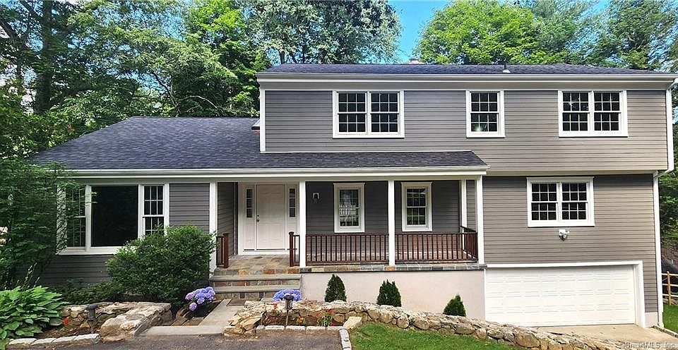 This newly renovated colonial home is nestled in a private wooded setting, yet just minutes from the booming metropolis of downtown Stamford. Great curb appeal with a stone wall & pillared entrance plus a new roof, Anderson windows, & Hardiplank siding. Bring your rocking chair for the front porch with mahogany railing. Great for entertaining with spacious living & dining rooms. The brand-new kitchen with warm cinnamon wood cabinets, granite countertops, skylight, large breakfast bar & new stainless-steel appliances is fabulous! It opens to the family room which is clad with an entire wall of handsome exposed brick. Cozy up to a wood-burning fireplace. Sliders open to a large deck. The tremendous bonus room with full bath & separate entrance could be a first-floor au pair or primary suite. Laundry is on the main level, too. Upstairs, the primary bedroom suite has a full bath with whirlpool tub. There are three additional nicely sized bedrooms & a newly renovated hall bath. The surprise is in the fully finished walkout lower level with a den, office & rec room. Refinished hardwood floors throughout, fresh paint & so much more. Enjoy the outdoors with two expansive side yards. New composite deck shaded by mature trees. There is also a stone patio with views of the larger side yard. Central air, central vac, two-car garage, parking for several cars. Close to Trader Joes. ACCESS CEDAR HEIGHTS RD FROM HIGH RIDGE RD. THE ROAD IS CLOSED AT WIRE MILL DUE TO CONSTRUCTION.