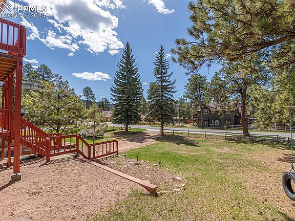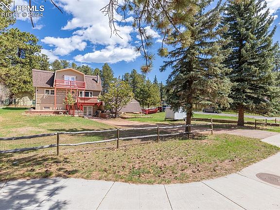Great location in Woodland Park just off Hwy 24 when you come into town. This home is sorrounded by Big beautiful Trees and on a large corner lot with lots of parking. There is parking in the front of the home with access to the basement or walk up the stairs to the main level of the home. There is a two car oversized garage with a non-traditional access to the basement. There is a wrap around balcony off the main level and a bacony of the Primary bedroom up stairs. Great views and the neighborhood is quiet with great neighbors who take pride in their homes. No HOA in this community. The Main level is bright and open. Right when you walk in there is a dining room with a wood burning stove, galley kitchen and two sitting rooms to your left. The Kitchen is nice and bright with great views! New carpet throughout, fresh paint and other updates to make this home move in ready. The stairs to the second story are lined with stone work and the laundry is tucked under the stairs on the main floor. The Second Story has three bedrooms and one bathroom. Full Basement with bedroom and bathroom tucked behind french doors. The basement has a full living room with double doors to the side yard and a unique passage to the garage. The garage is oversized. *More pictures coming