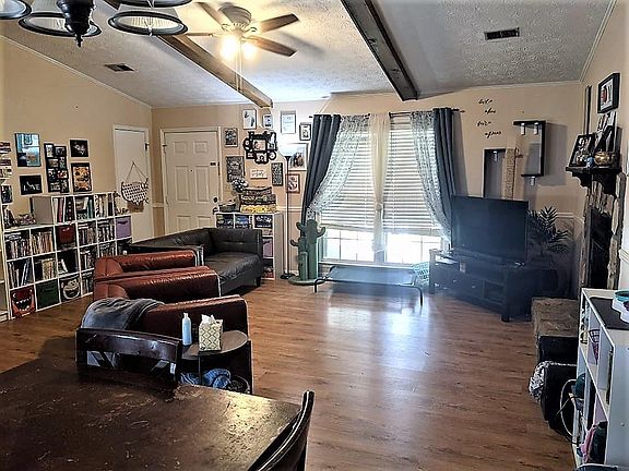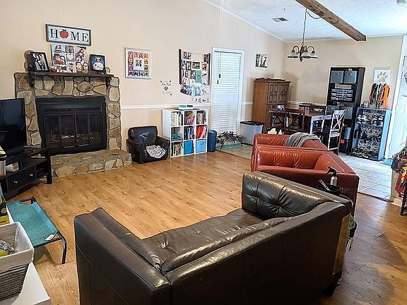 Sweet, Affordable 3 bedroom 2 bath ranch style home situated on 0.97 acres. Beautiful stone fireplace in the family room with exposed beam vaulted ceiling. All Kitchen appliances remain, including refrigerator.