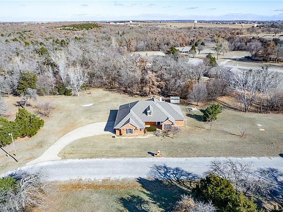 A QUIET OASIS ON NEARLY 2 ACRES with easy ACCESS to I-35! Enjoy the beauty of nature in this 4 BEDROOM, 2 bath brick home with 3 car garage and plenty of privacy. Real HARDWOOD floors throughout entry way and 4th bedroom (that could also be used as an OFFICE). The home features TALL ceilings in every room. SPACIOUS kitchen has GRANITE countertops, BAR area, TONS of storage and HUGE DINING ROOM that is large enough to accommodate a table of any size! Primary bedroom suite features WHIRLPOOL tub with separate shower, double sinks, large walk-in closet, and a door to BACK PATIO with views of the TREES and CREEK. All bedrooms are very nice-sized! LAUNDRY ROOM features SINK and plenty of STORAGE. Home has all tile and wood floors (NO CARPET). Backyard has STORM SHELTER, GREENHOUSE, and plenty of space for games and entertainment. Put this one on your list to see today!!!