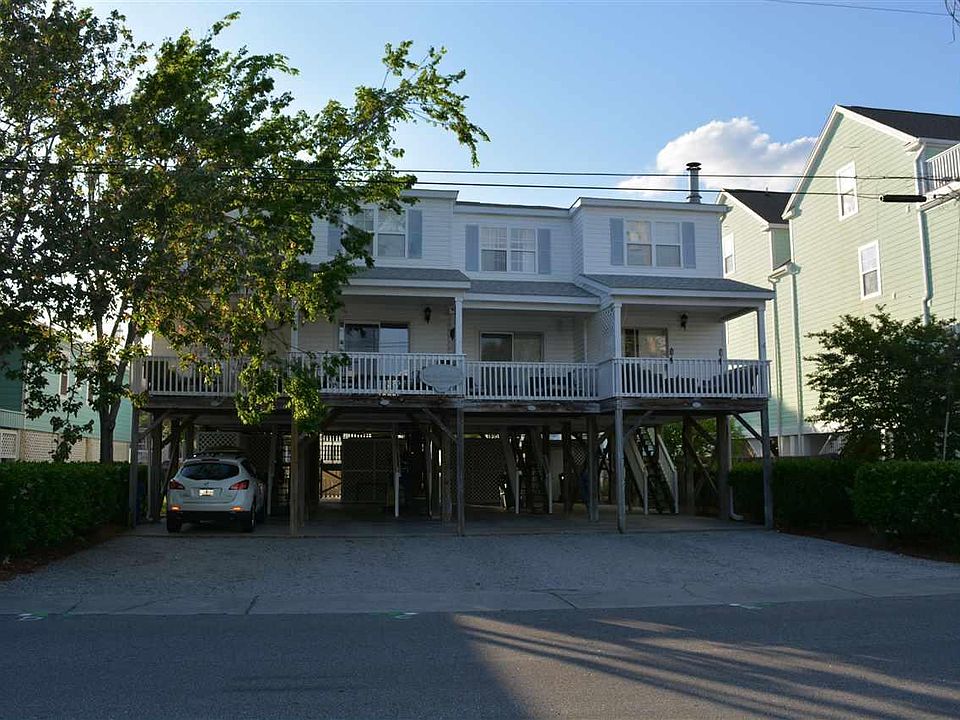 Just a short walk to the beach. New roof 2015. Second unit from the right. Great rental income; always rented, unit B has laminate wood floors in the great/dining room, tile in the kitchen, covered front porch, open deck overlooking newer in-ground swimming pool, fenced yard, storage closet underneath and outside shower. Parking underneath and in driveway.