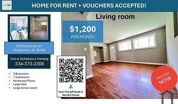 Great 3 Bedroom + Vouchers Accepted! Yes, 3-bedroom vouchers are accepted! *Want to tour this home on your own? **Wonderful 3 bed home in Forest Hills area of Montgomery! Central air conditioning, a living room/dining room style great room, large grassy front and back yards, 3 bedrooms and a huge bonus room make this a great place to live! For more properties like this visit Affordable Housing.