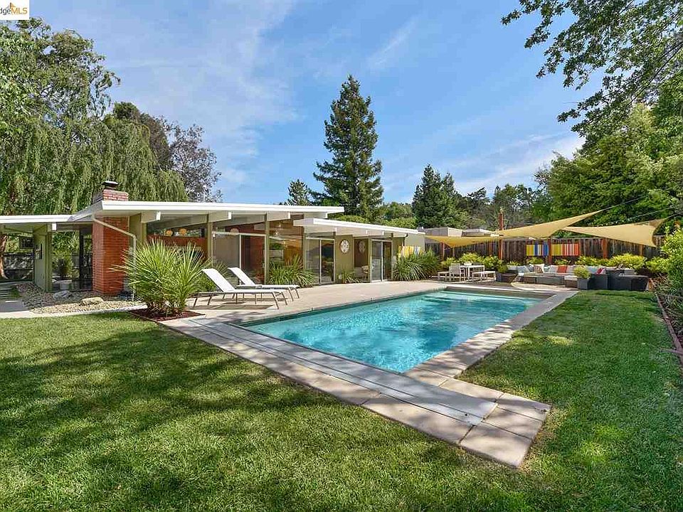 Just in time for summer, experience permanent vacation in this modernized & impeccably restored 4 bedroom, 2 bath courtyard-style Eichler with a stunning five-star level resort pool! Located on a sunny level parcel in Rancho San Miguel, original-character details like full-height glass walls overlooking private lush gardens, globe lighting, in-floor radiant heating, VCT flooring, and mahogany wall paneling highlight clean mid-century design. The master suite with walk-in closet and en suite bath and family room have poolside access via glass sliders and the completely original kitchen is airy and bright thanks to large clearstory windows. There's even the vintage Thermador built-in oven, cooktop, and swing-out island table functional and in tact! Highly regarded schools, BART and freeway access are nearby and restaurants, coffee, & shopping are a short stroll through the neighborhood. Rare opportunity purist Eichler exemplifying the best of the California indoor/outdoor lifestyle!