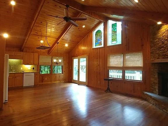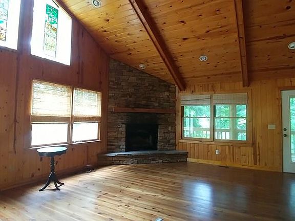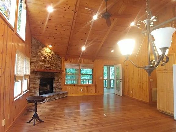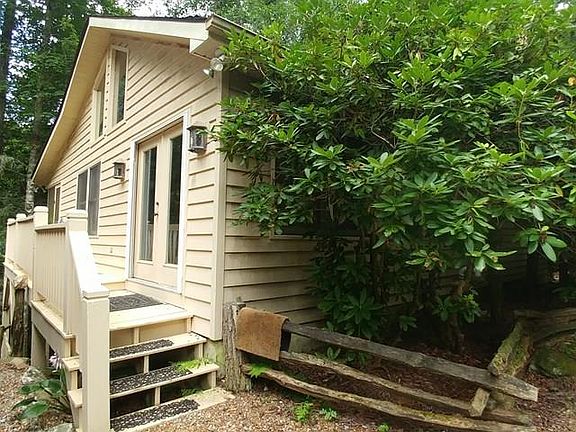 Cheerful & Comfortable this cottage has cathedral wood ceilings and wood floors throughout. Granite counter-top/back-splash in upscale kitchen. Great room has stacked stone wood-burning fireplace. Living room and master open to covered/screened porch. Listen to the sound of rushing water from nearby dam. Tile baths. Perennial terraced landscaping. Additional partially finished room below home for storage/expansion. Single carport steps from door. Warm in winter/cool in summer. Great year round living! View of Billy Cabin Mtn. from porch.